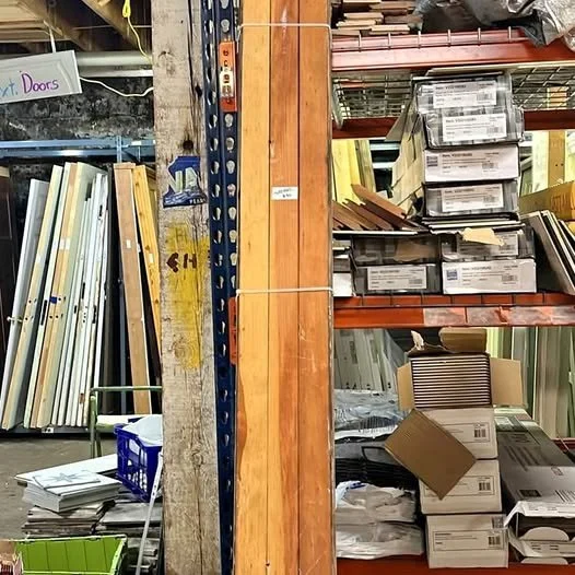 White window frames leaning against a storage rack in a warehouse, with shelves containing various building materials and tools in the background.